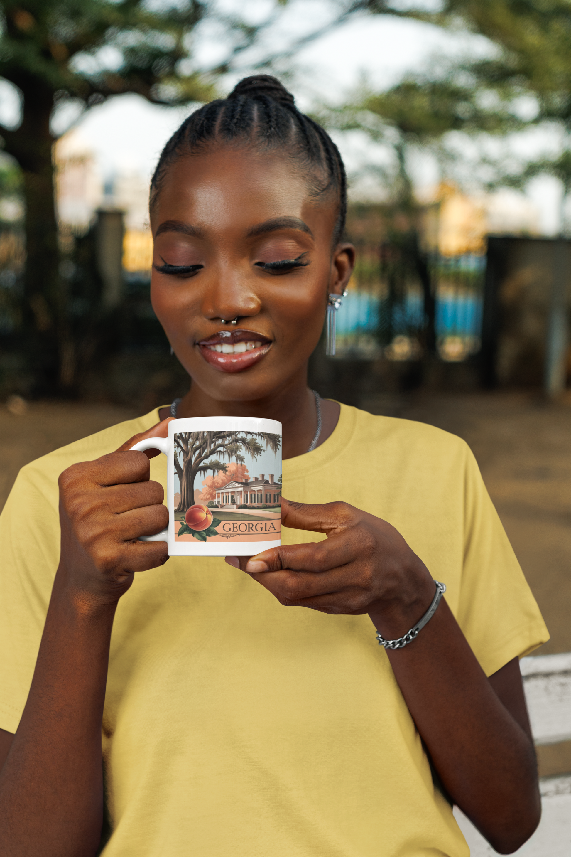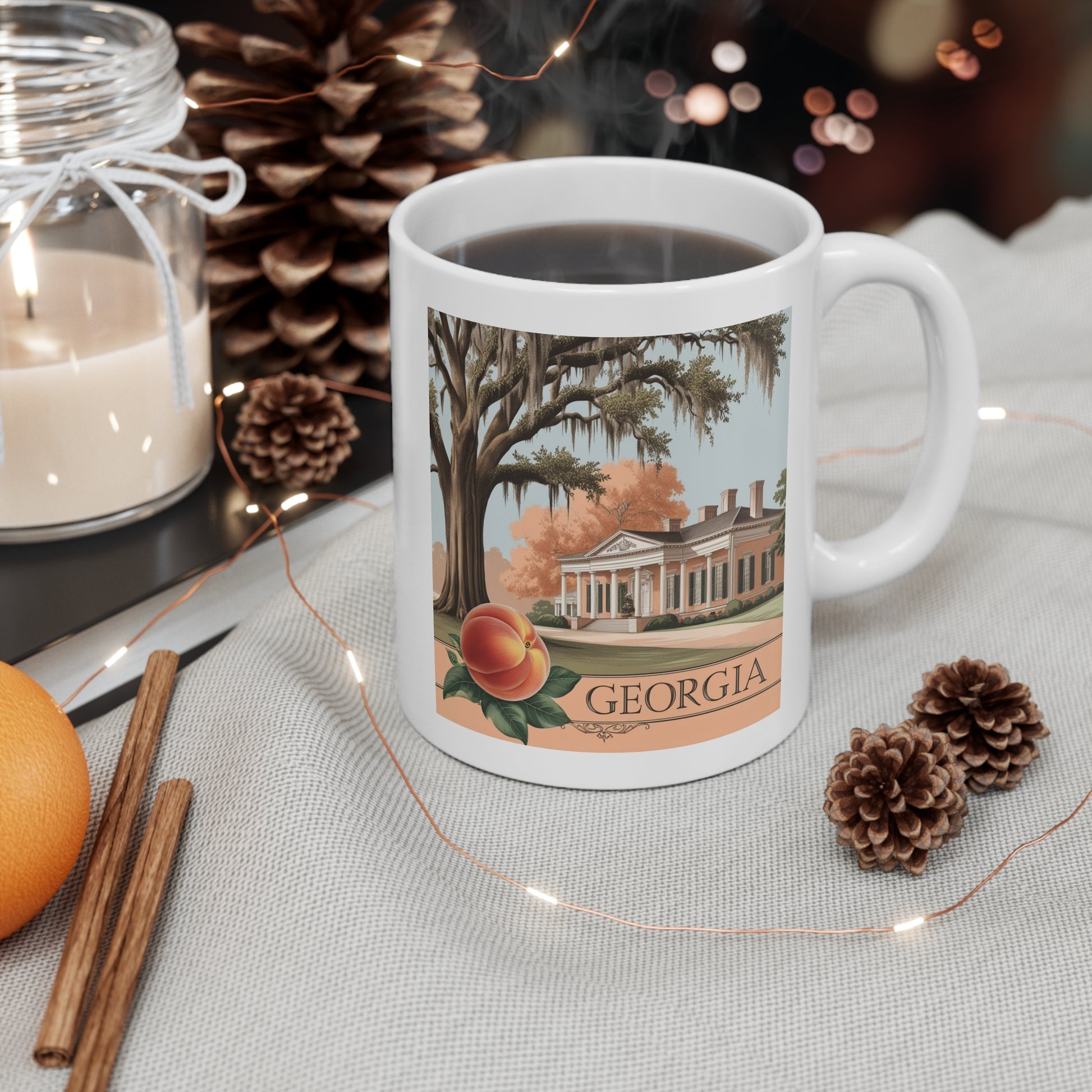 Elevate your morning routine with this beautifully designed mug. This charming 11oz ceramic mug features stunning artwork inspired by the natural beauty of Georgia, featuring a peach and a majestic oak tree. Perfect for sipping your favorite coffee or tea, it adds a touch of southern charm to your day. Ideal for anyone who loves a cozy kitchen aesthetic or wants to celebrate their Southern roots. It's a wonderful gift for birthdays, housewarming parties, or as a thoughtful gesture during festive seasons like Thanksgiving and Christmas. Start your mornings with warmth and style!