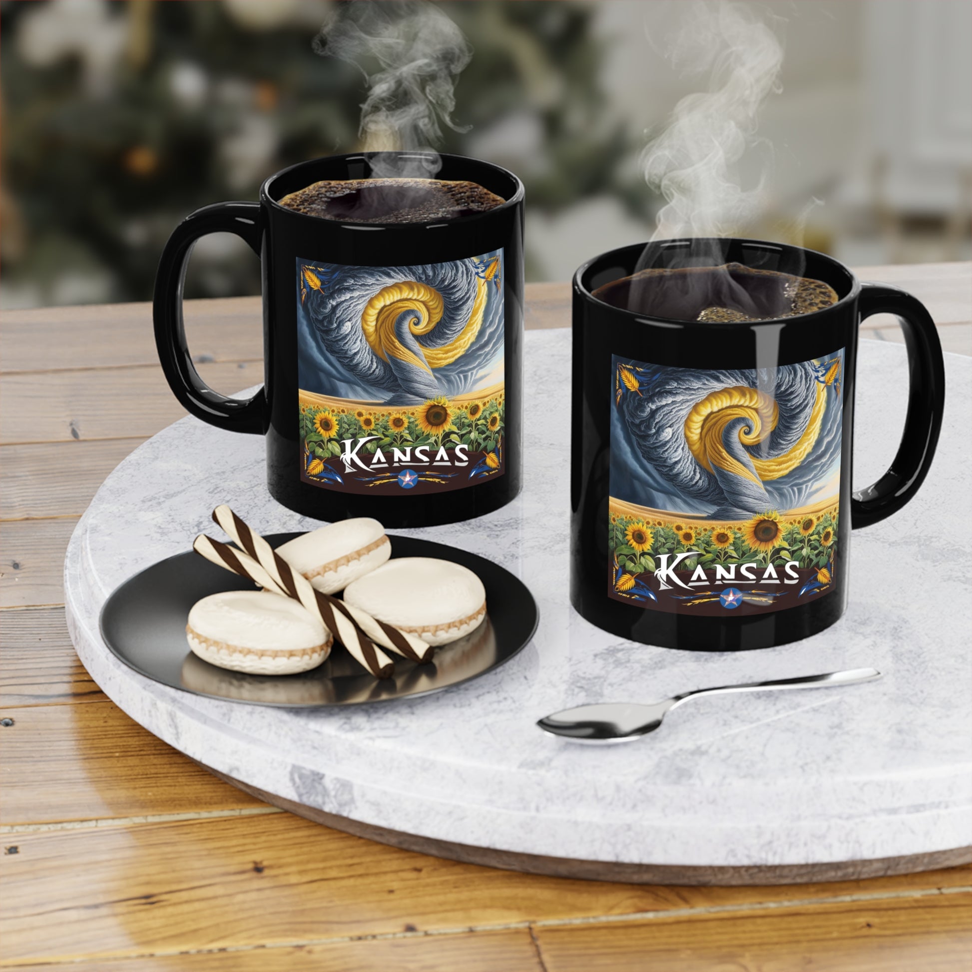 Kansas Themed Black Coffee Mug - 11oz with Sunflowers & Storm Design